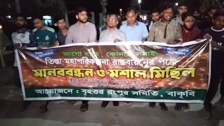 আইয়ুব আলী ময়মনসিংহ :: ইন্টেরিম সরকার ঘোষিত তিস্তা মহাপরিকল্পনা দ্রুত বাস্তবায়নের দাবীতে বাংলাদেশ কৃষি বিশ্ববিদ্যালয় শাখা বৃহত্তর রংপুর সমিতির উদ্যেগে বৃহস্পতিবার সন্ধায় মানববন্ধন এবং মশাল মিছিল অনুষ্ঠিত হয়েছে। মানববন্ধন শেষে বক্তারা বলেন, তিস্তা সংকট দেশের একটি জাতীয় সমস্যা, তিস্তা পাড়ের ৫ টি জেলা রংপুর, গাইবান্ধা, লালমনিরহাট, নীলফামারী এবং কুড়িগ্রাম জেলার মেহনতি মানুষ, কৃষক-শ্রমিক, দিনমজুরসহ সকলেই তিস্তার পানির ন্যায্য হিস্যা থেকে বঞ্চিত। ইনটেরিম সরকার দায়িত্ব নেওয়ার পর তিস্তা মহাপরিকল্পনা বাস্তবায়নের ঘোষণা দিলেও দুঃখের বিষয় তিস্তা মহাপরিকল্পনা বাস্তবায়নের জন্য যে সময় নির্ধারণ করেছিলো ইনটেরিম সরকার তা এখনো বাস্তবায়ন শুরু করা হয় নি। মিছিল ও মানববন্ধনে বক্তব্য রাখেন, প্রফেসর ড. মো. আসাদুজ্জামান সরকার, বাংলাদেশ কৃষি বিশ্ববিদ্যালয় শিক্ষক সমিতির সাধারন সম্পাদক ও সহ সভাপতি বৃহত্তর রংপুর সমিতি বৃহত্তর রংপুর সমিতির কোষাধ্যক্ষ ইঞ্জিনিয়ার এনামুল হক, যুগগ্ম সাধারন সম্পাদক মেজবাউল হক মিজু, ছাত্র ফ্রন্টের সাধারন সম্পাদক সঝিব দাস, ছাত্র শিবিরের সাধারন সম্পাদক আব্দুল্লাহ আল মঈন প্রমুখ।