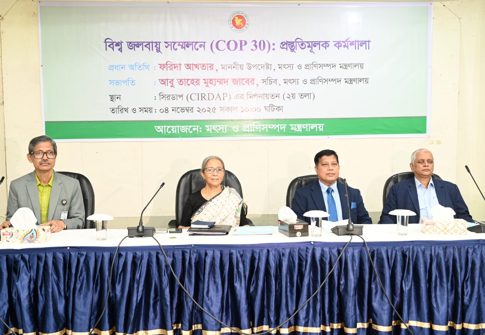 কর্মশালায় সভাপতিত্ব করেন মৎস্য ও প্রাণিসম্পদ মন্ত্রণালয়ের সচিব আবু তাহের মুহাম্মদ জাবের। স্বাগত বক্তব্য প্রদান করেন মন্ত্রণালয়ের অতিরিক্ত সচিব মোঃ ইমাম উদ্দীন কবীর। “বিশ্ব জলবায়ু সম্মেলন (COP-30)”–এর ধারণাপত্র উপস্থাপন করেন পরিবেশ, বন ও জলবায়ু পরিবর্তন মন্ত্রণালয়ের অতিরিক্ত সচিব মোহাম্মদ নাভিদ শফিউল্লাহ।