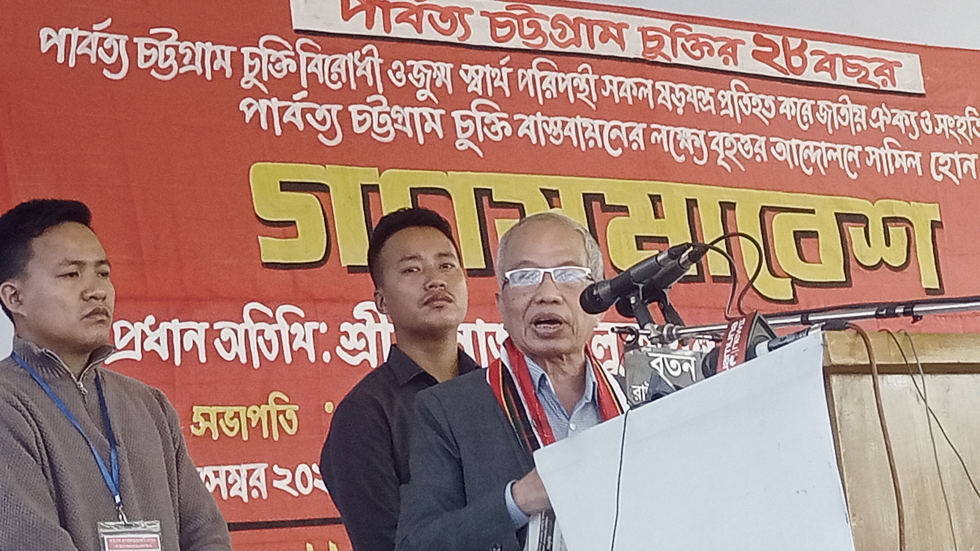 গতকাল মঙ্গলবার পার্বত্য চট্টগ্রাম চুক্তির ২৮তম বর্ষ পূর্তি উপলক্ষ্যে রাঙ্গামাটি শহরে জিমনেসিয়াম মাঠে আয়োজিত গণ সমাবেশে প্রধান অতিথির বক্তব্যে পার্বত্য চট্টগ্রাম জনসংহতি সমিতি (পিসিজেএসএস) এর কেন্দ্রীয় কমিটির সহ-সভাপতি ও সাবেক সংসদ সদস্য ঊষাতন তালুকদার এ কথা বলেন।