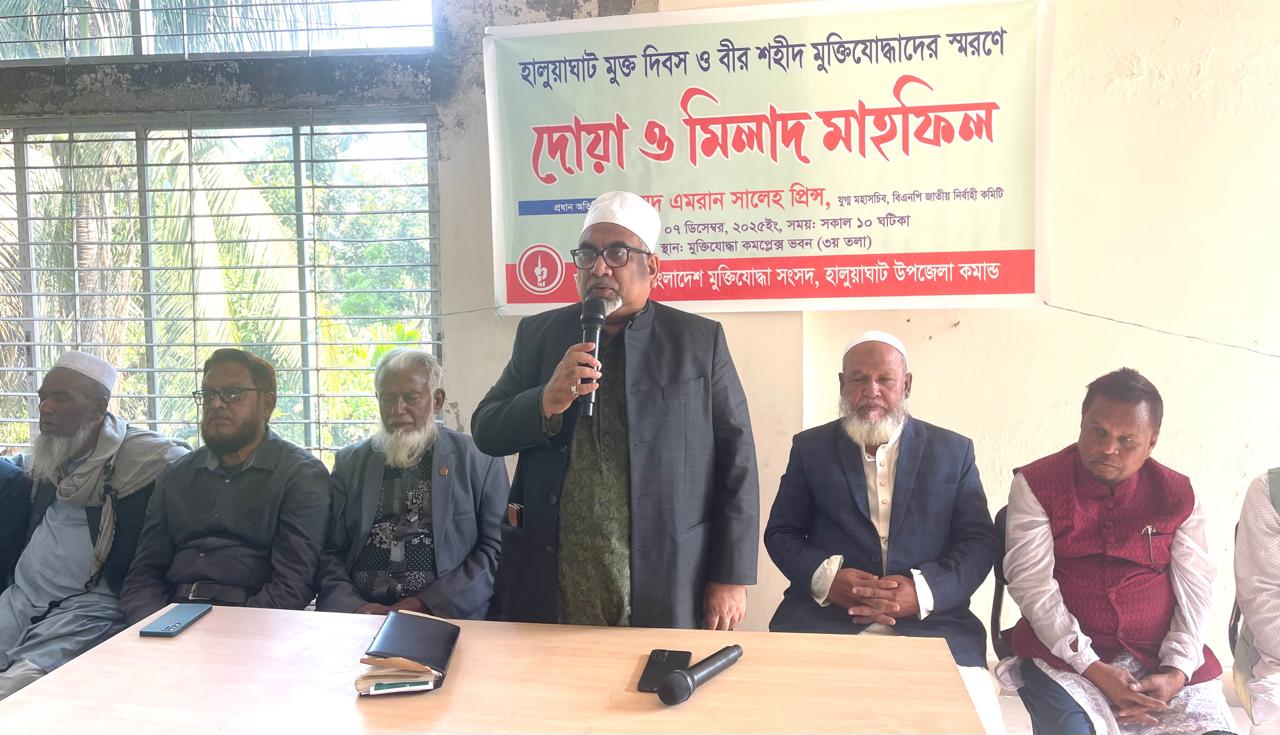 আইয়ুব আলী ময়মনসিংহ :: আজ হালুয়াঘাট মুক্ত দিবস। এদিন হানাদার বাহিনীর কবলমুক্ত হয় এই উপজেলা। দিনটি উপলক্ষে আজ হালুয়াঘাট মুক্তিযোদ্ধা কমান্ড কাউন্সিলের উদ্যোগে আলোচনা সভা ও দোয়া মাহফিল অনুষ্ঠিত হয়। সকাল ১০টায় উপজেলা মুক্তিযোদ্ধা কমপ্লেক্স প্রাঙ্গণে জাতীয় ও মুক্তিযোদ্ধা সংসদের পতাকা উত্তোলনের মধ্য দিয়ে দিনের কর্মসূচির সূচনা করা হয়। অনুষ্ঠানে মুক্তিযোদ্ধা, রাজনৈতিক নেতৃবৃন্দ, গণ্যমান্য ব্যক্তিবর্গসহ বিভিন্ন শ্রেণি–পেশার মানুষ অংশ নেন। আলোচনাসভায় শহীদ মুক্তিযোদ্ধাদের আত্মার মাগফিরাত ও দেশের উন্নতি–সমৃদ্ধি কামনাসহ অসুস্থ বিএনপি চেয়ারপার্সন বেগম খালেদা জিয়ার সুস্থতা কামনায় বিশেষ দোয়া মাহফিল পরিচালনা করা হয়। সভায় প্রধান অতিথির ভাষন দেন বিএনপির যুগ্ম মহাসচিব ময়মনসিংহ-১, হালুয়াঘাট-ধোবাউরার বিএনপির প্রার্থী সৈয়দ এমরান সালেহ প্রিন্স। পরে নেতাকর্মীদের সাথে নিয়ে তিনি এলাকায় নির্বাচনী গনসংযোগ পরিচালনা করেন ।