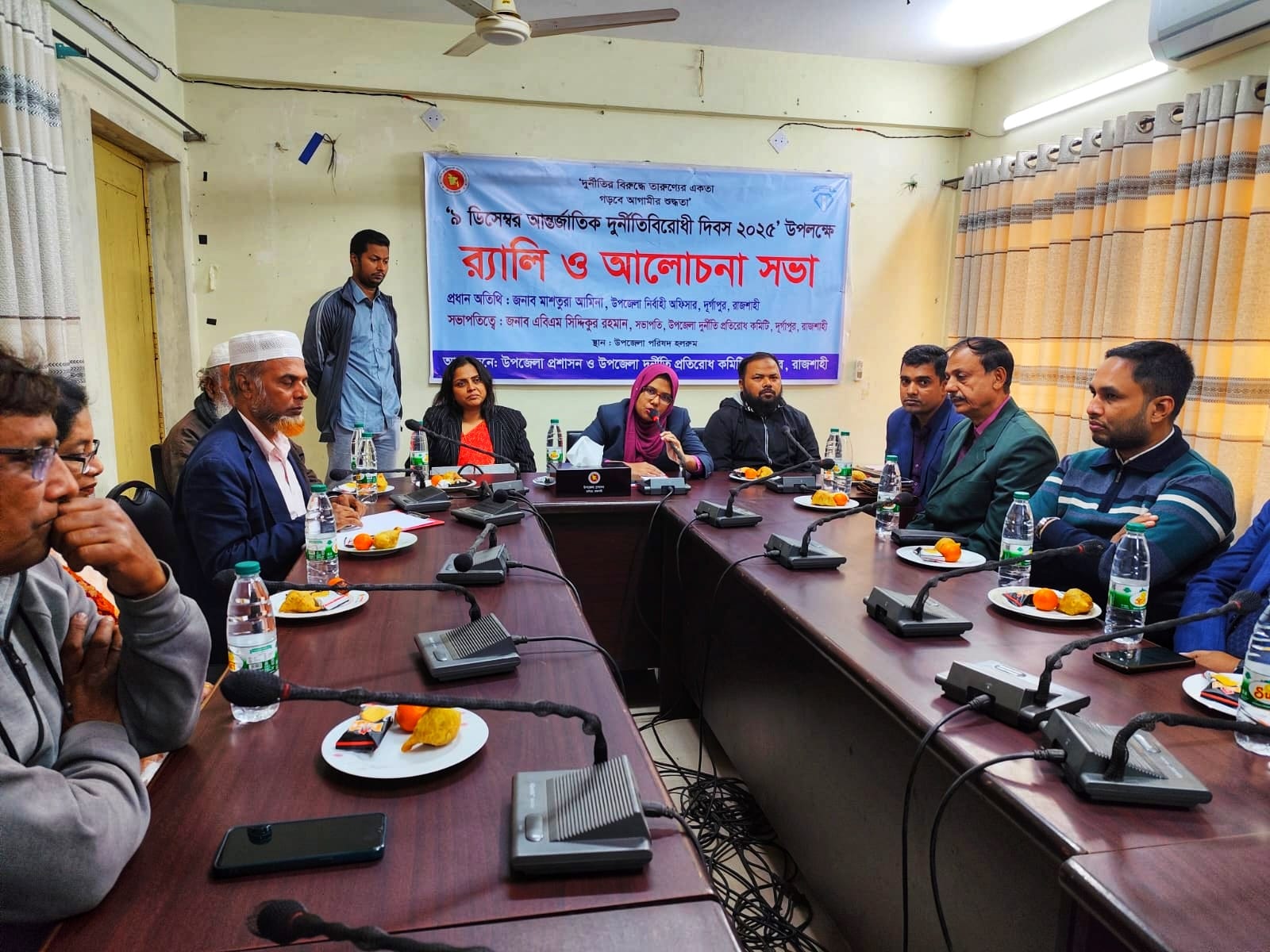 জিএম কিবরিয়া, দুর্গাপুর, রাজশাহী :: রাজশাহীর দুর্গাপুরে ‘দুর্নীতির বিরুদ্ধে তারুণ্যের একতা গড়বে আগামীর শুদ্ধতা’ এই প্রতিপাদ্য স্লোগানকে সামনে রেখে “আন্তর্জাতিক দুর্নীতিবিরোধী দিবস ২০২৫’ উপলক্ষে উপজেলা প্রশাসন ও উপজেলা দুর্নীতি প্রতিরোধ কমিটির আয়োজনে র্যালি ও আলোচনা সভা অনুষ্ঠিত হয়েছে।