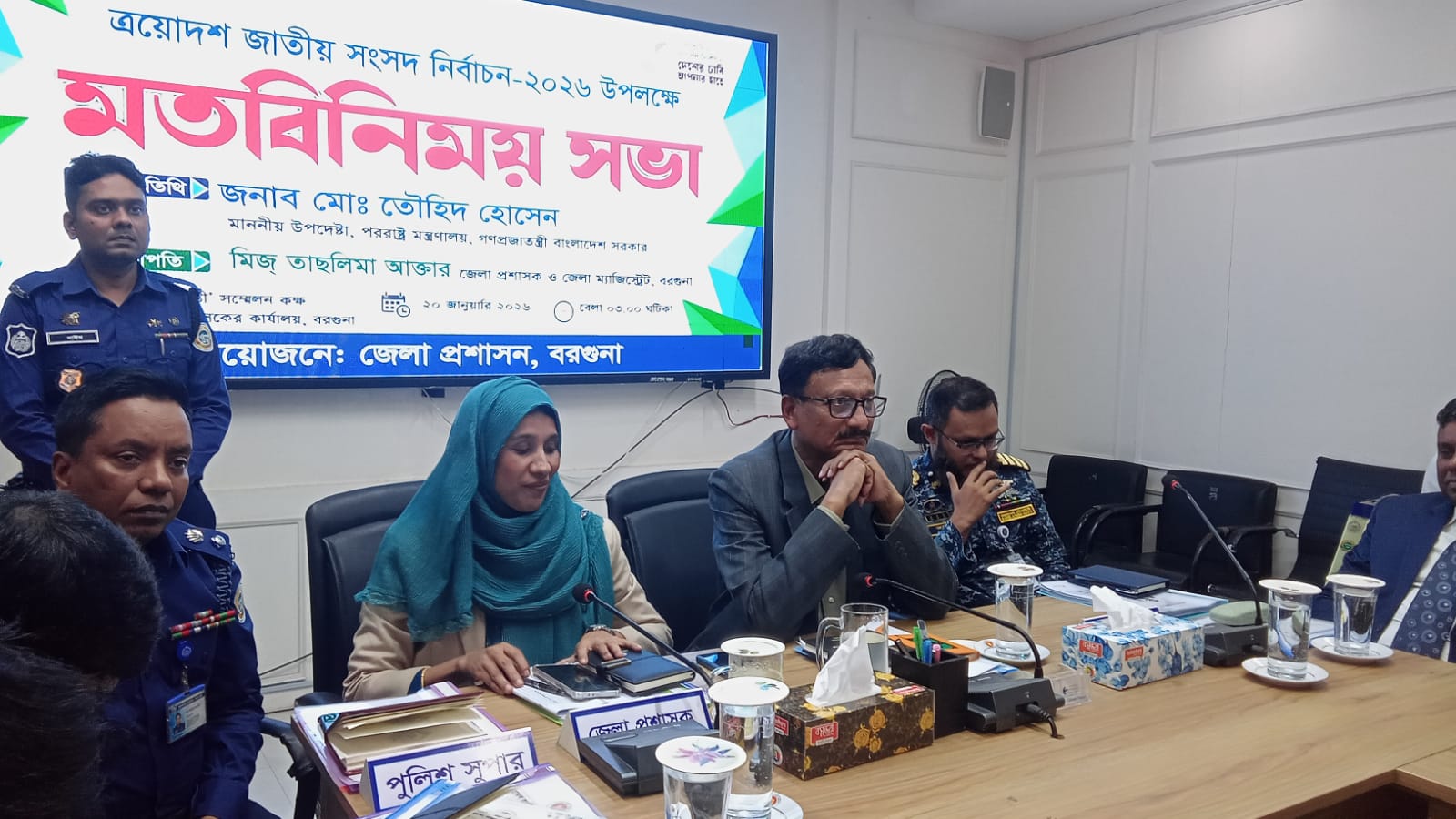 বরগুনা জেলা প্রশাসন কর্তৃক আয়োজিত ত্রয়োদশ জাতীয় সংসদ নির্বাচন উপলক্ষ্যে মঙ্গলবার (২০ জানুয়ারি) বিকেলে জেলা প্রশাসক কার্যালয়ের সুবর্ণজয়ন্তী সম্মেলন কক্ষে মতবিনিময় সভায় সভাপতিত্ব করেন- বরগুনা জেলা প্রশাসক ও জেলা ম্যাজিস্ট্রেট তাছলিমা আক্তার।